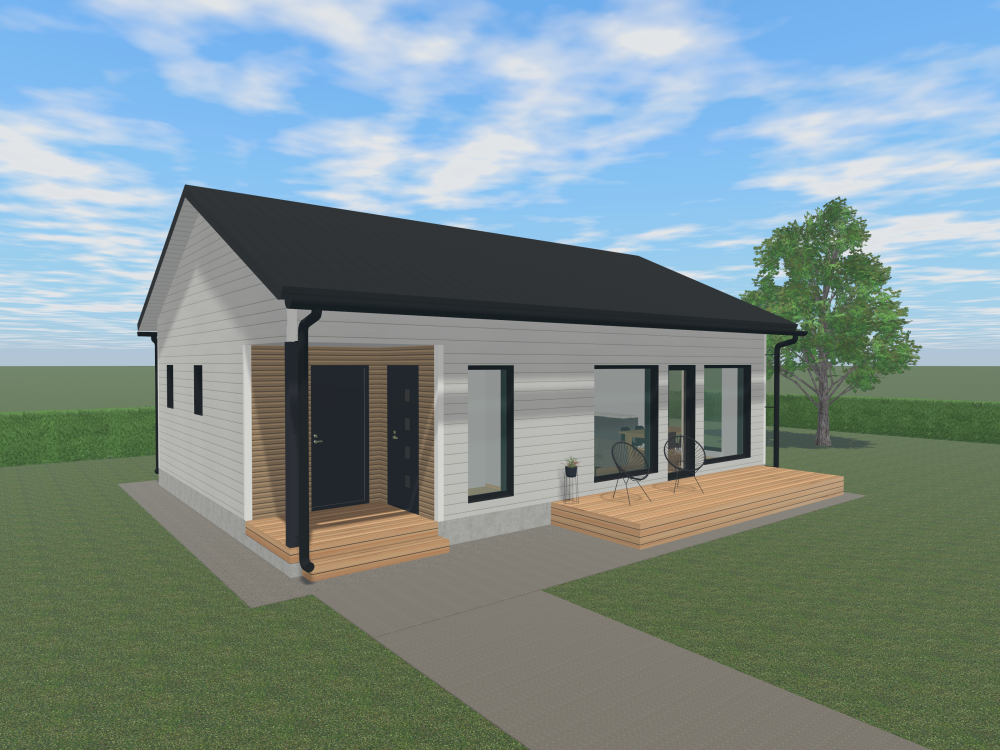 Valmiskoti 74 yhdistää käytännöllisyyden ja viihtyisyyden ainutlaatuisella tavalla, tarjoten kompaktista koostaan huolimatta kaikki modernin kodin mukavuudet. Avara olohuone ja ruokailutilan yhdistelmä luo tilan tuntua, ja suuri terassi tarjoaa lisäelintilaa ulkoilmassa.